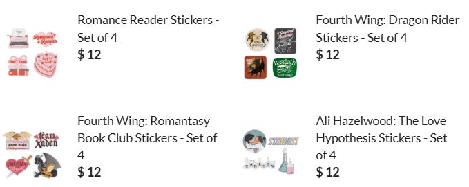 They have stickers now! Two sets for Fourth Wing (romantasy series), one for Ali Hazelwood’s The Love Hypothesis, and one for romance in general:
